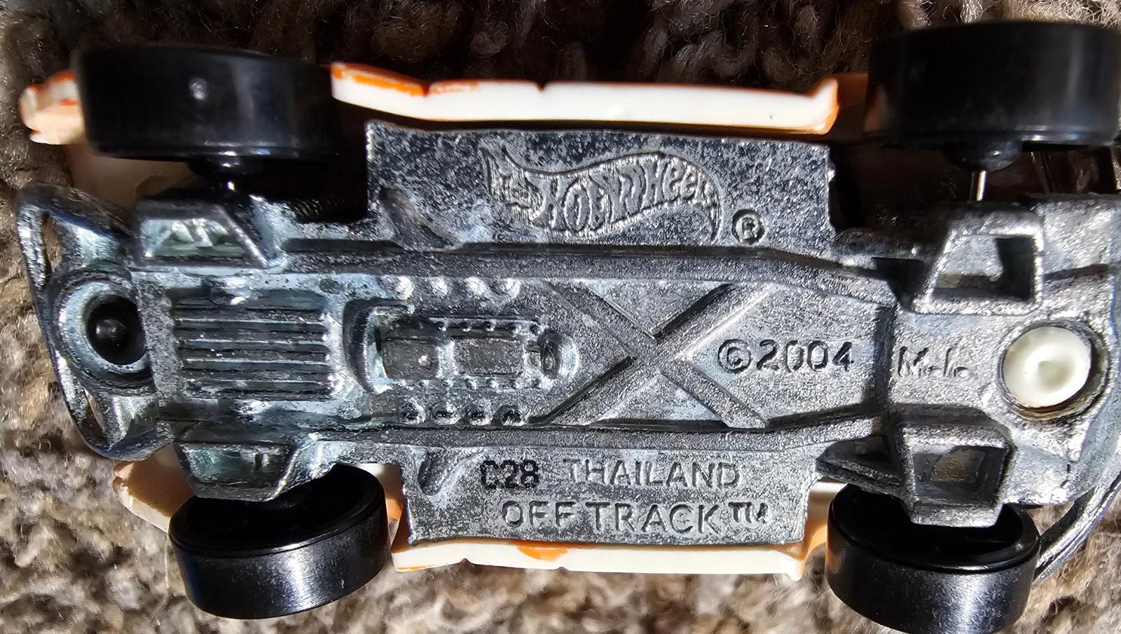 The product is a 2004 Mattel Hot Wheels Orange Off Track Race Car diecast in 1:64 scale. This toy vehicle is part of the Hot Wheels brand's contemporary manufacture line and is made of diecast material. The car features a vibrant orange color and belongs to the "Cars" character family. Manufactured in Thailand, this collectible piece is perfect for car enthusiasts and collectors looking to add a unique and eye-catching piece to their collection.