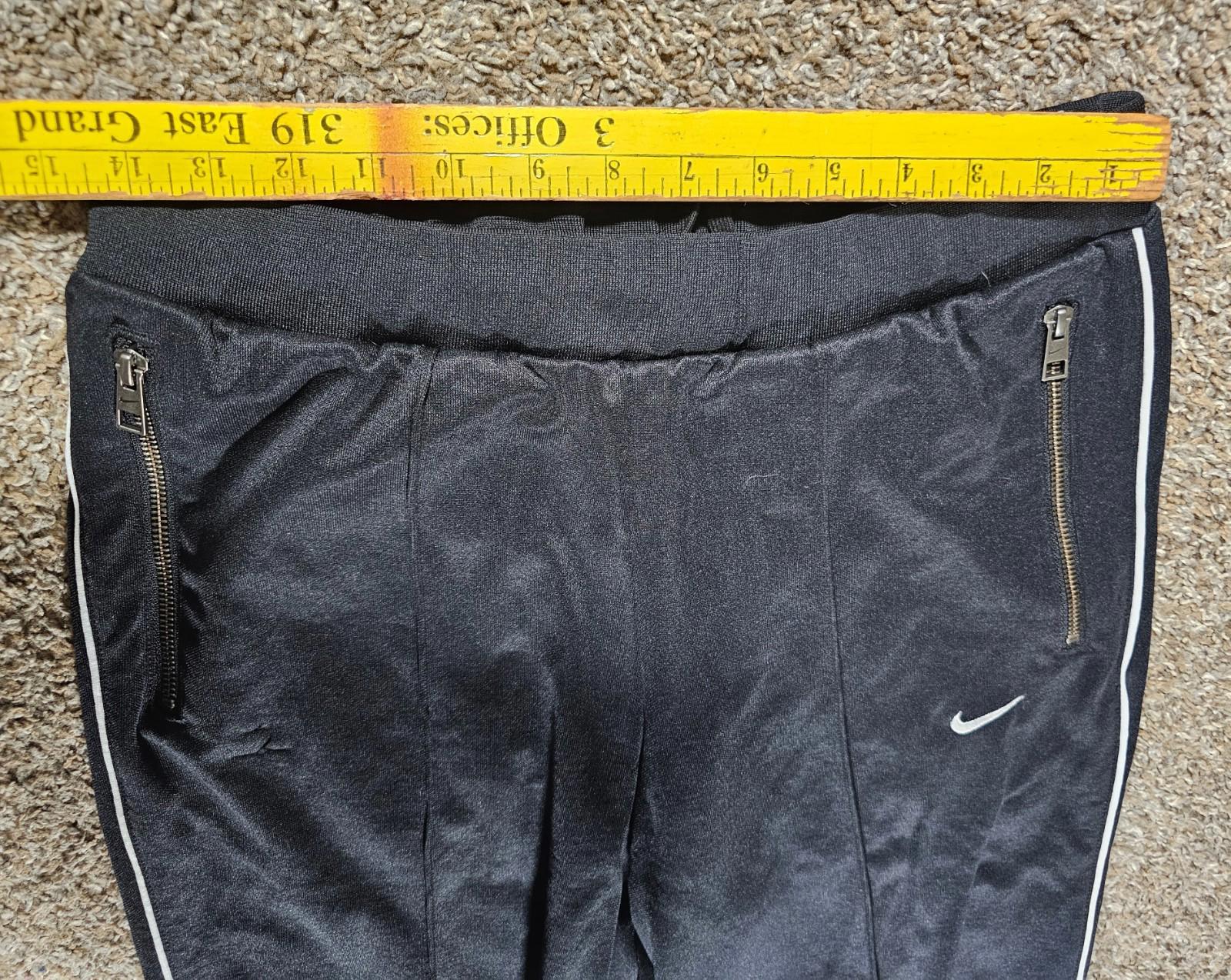 The product is a pair of Nike large athletic pants in a solid black color with a drawstring closure and zippered pockets. These sweatpants feature an elastic waist and a compression area at the waist for a comfortable fit. Ideal for activewear, the pants are suitable for gym training, cross-training, and running. Made with machine washable fabric, these athletic pants are perfect for all seasons and have a sleek athleisure style with the Nike logo.